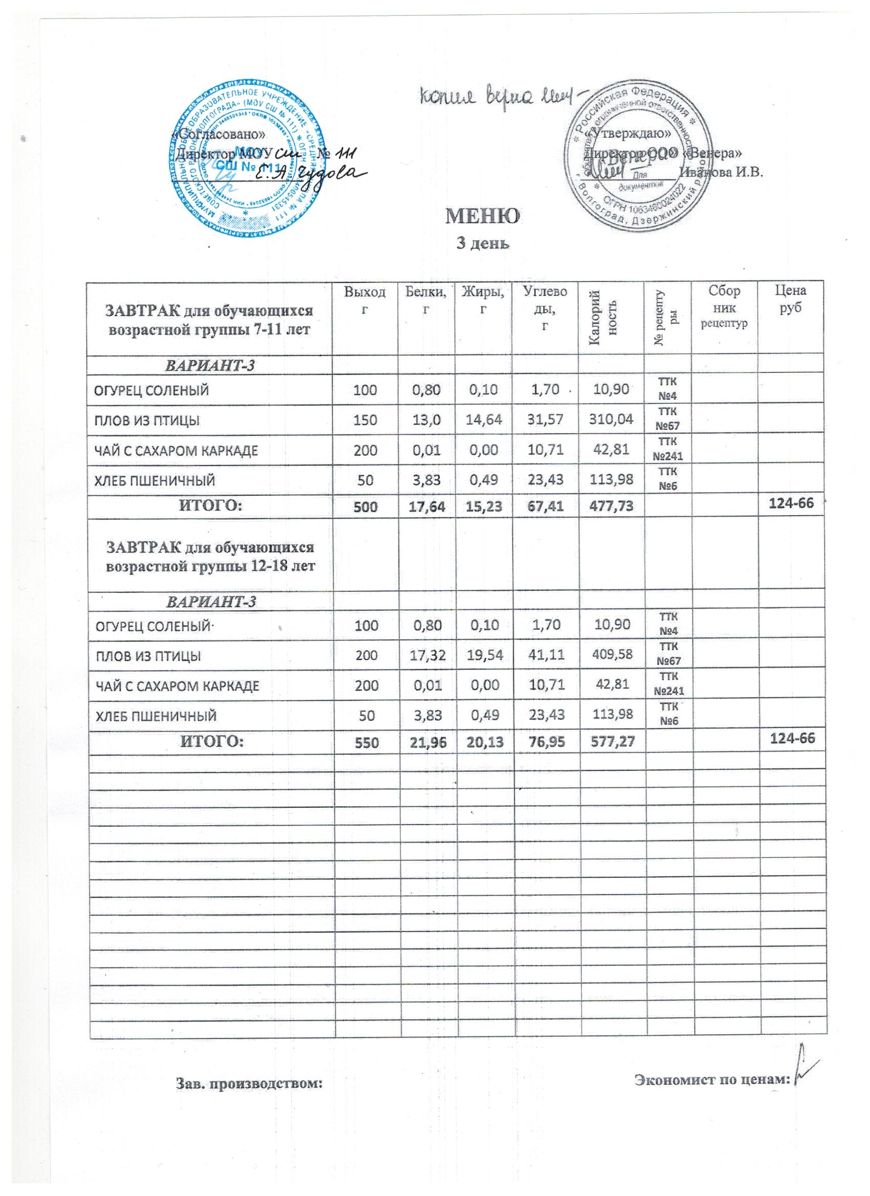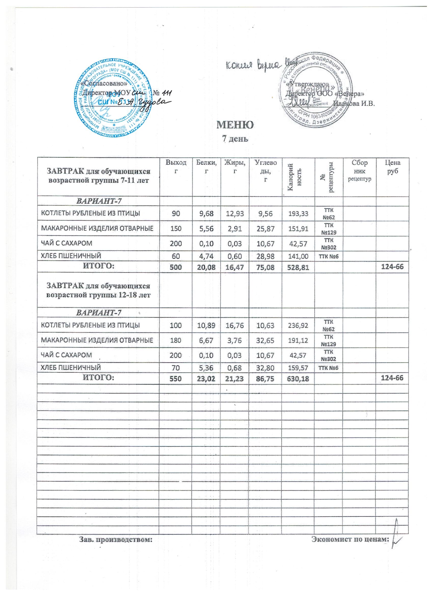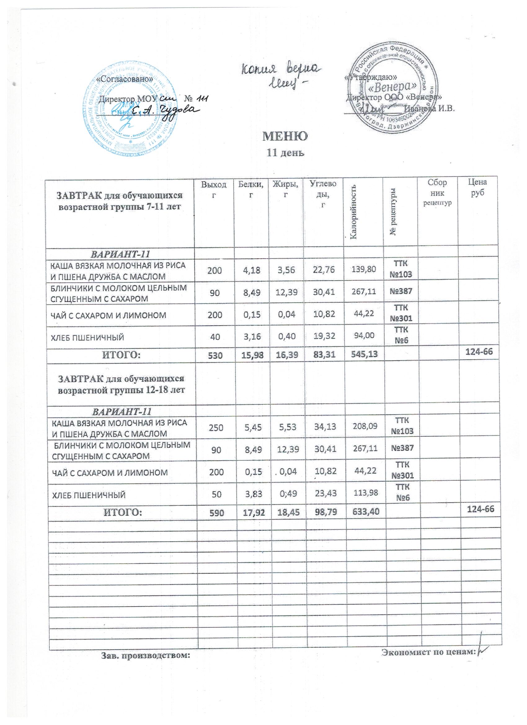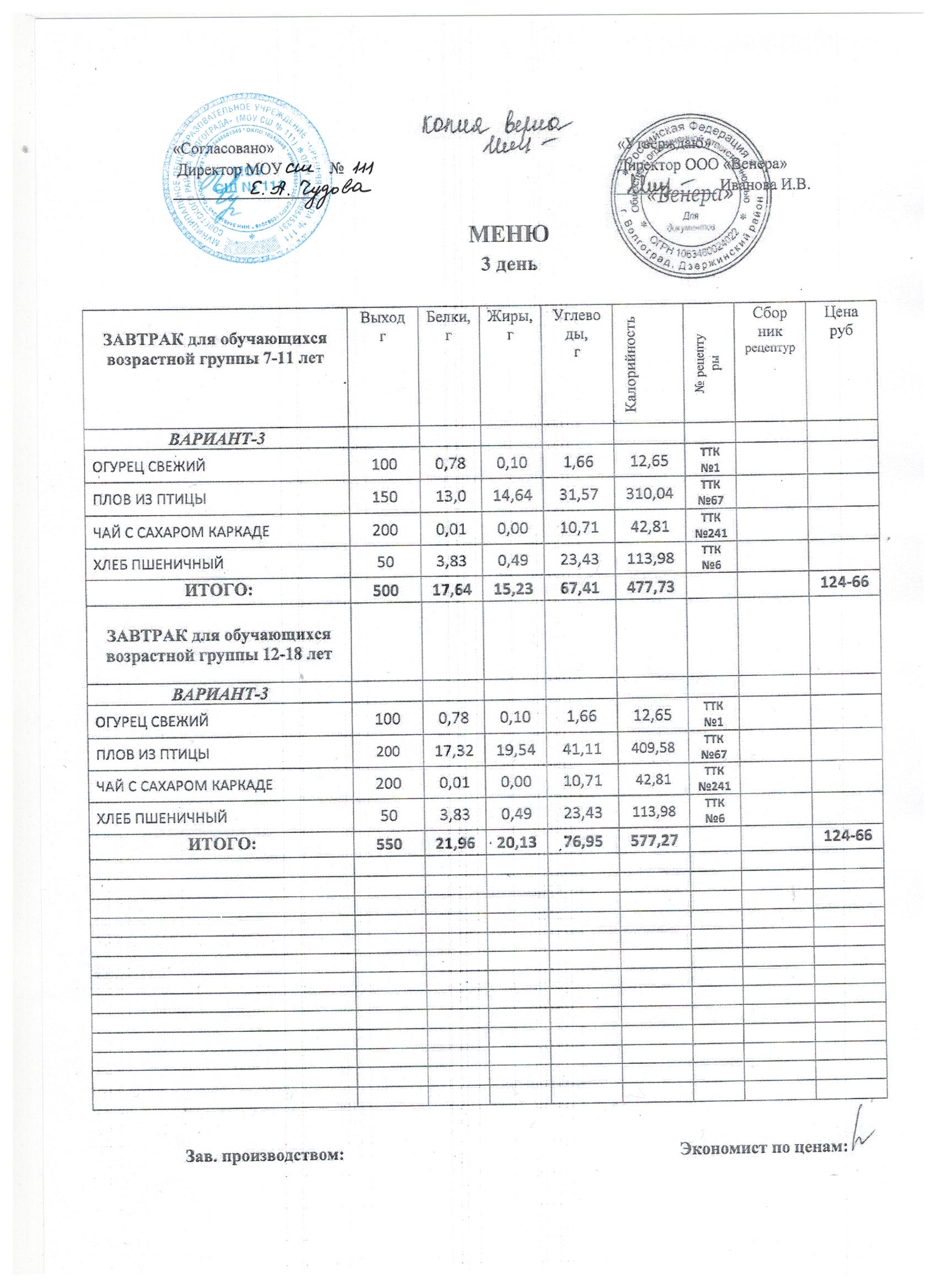 Питание в МОУ СШ № 111 осуществляет ООО «ВЕНЕРА»на основании муниципального контракта № 111/25/1 от 13.01.2025г. Директор: Иванова Ирина Валентиновна д. 39Б, офис 19 телефон: 8(8442) 48-32-57